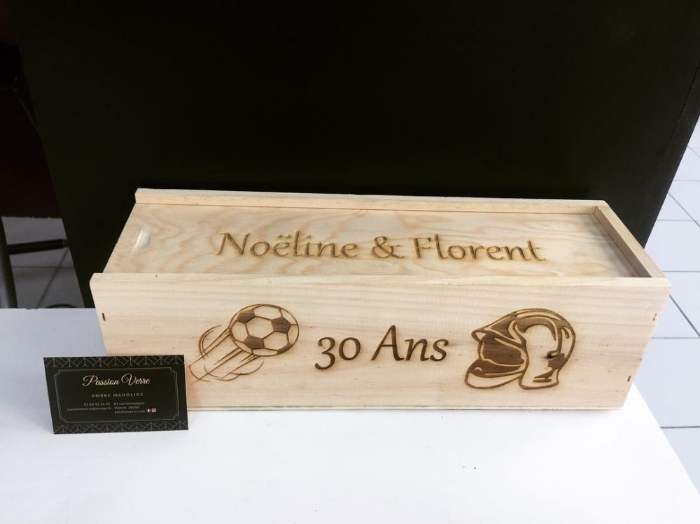 - Coffret à vin, personnalisez la boîte en bois plus la bouteille et les verres avec notre DM 350